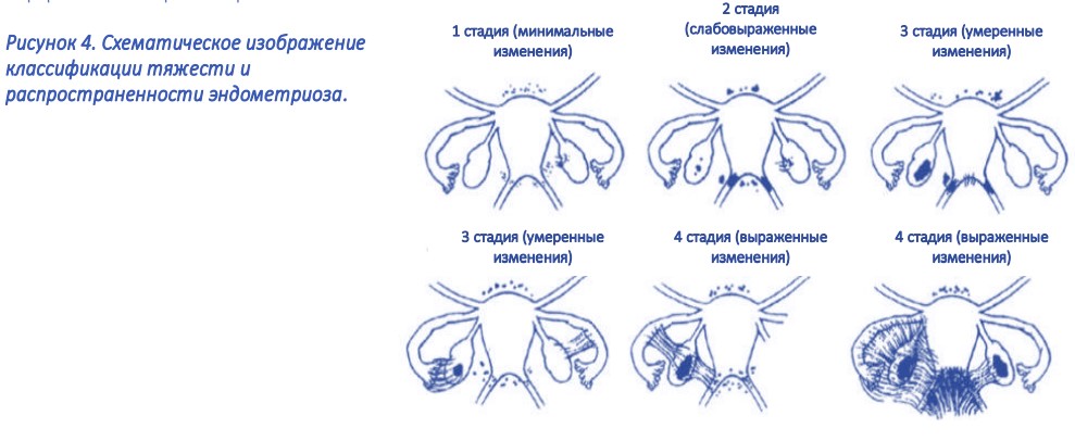 - Стадия 3 - 4 (средне-тяжелая или тяжелая степень заболевания): Наличие поверхностного эндометриоза брюшины, глубоко инвазивного эндометриоза с умеренными или обширными спайками между маткой и кишечником и/или эндометриомы с умеренными или обширными спайками с вовлечением яичников и труб.